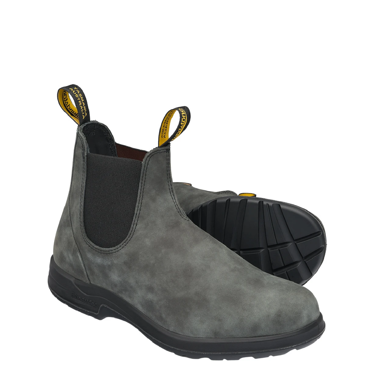 Blundstone has partnered with Vibram to create an exclusive outsole for the new #2055 All-Terrain boot in rustic black. Engineered to be worn with confidence in a range of tough environments, the sole is heat resistant up to 300°C and specifically rated to maintain performance down to -15°C. The standout curved heel, created through the tread and transverse flex points, provides self-cleaning properties to the already feature-packed All-Terrain