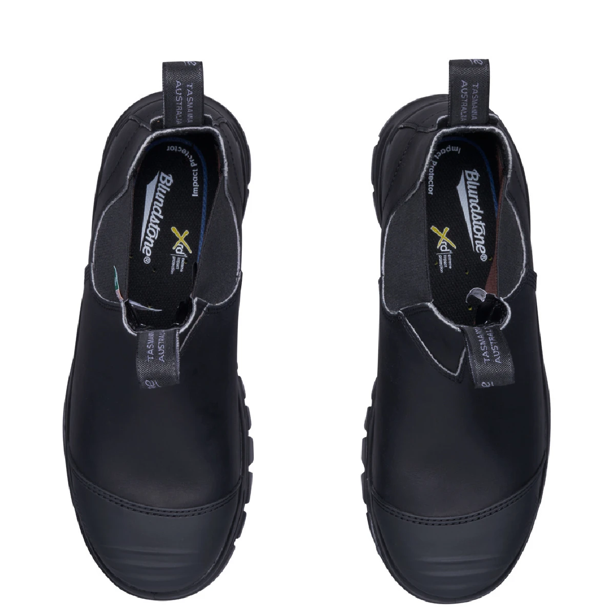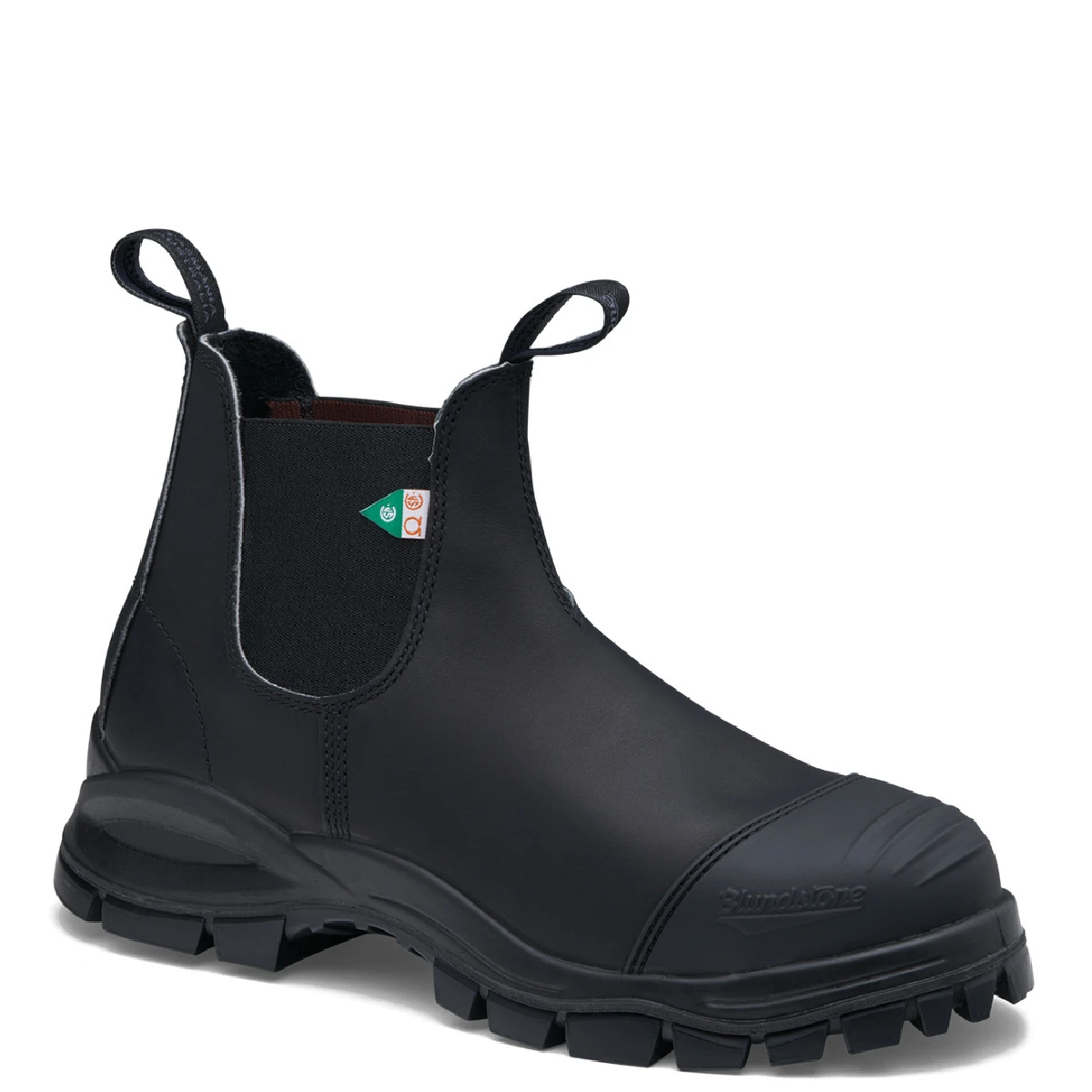 Blundstone CSA-approved 968 Work & Safety XFR boots in Black. These pull on work boots stand on a thicker, grippier, solid rubber lug sole for safe, long-wearing, all-season comfort and stability. Work boots for women and men with Comfort Arch footbeds to reduce stress on bones and joints, cushioning heel-strike impact by up to 90%. Product Details: