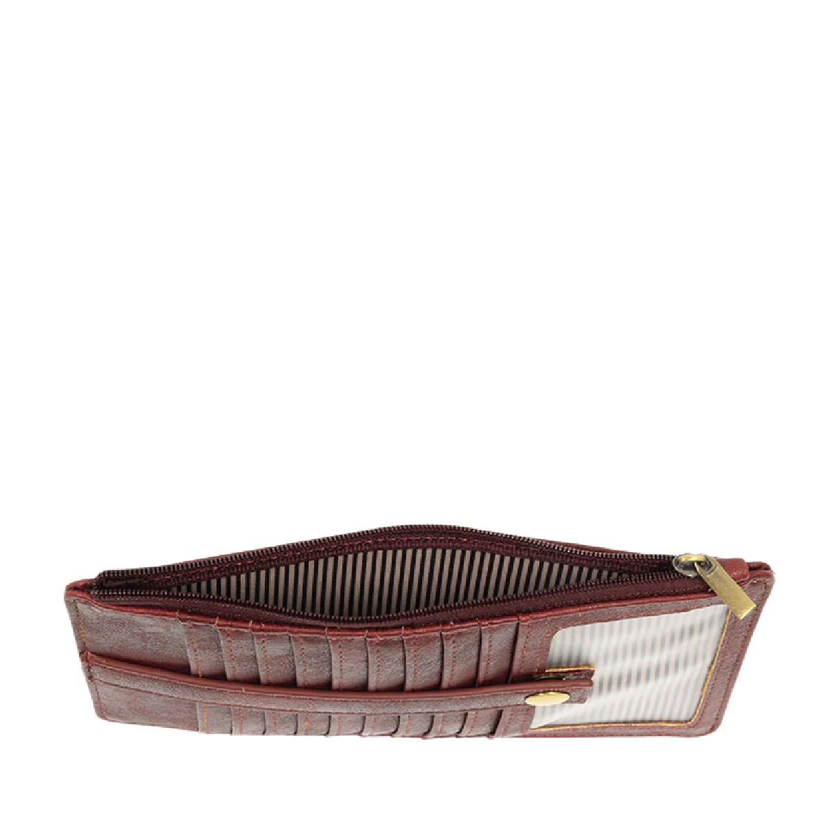 This slim and sleek card wallet has 9 credit card pockets, an ID window, zippered change pocket and zippered billfold pocket all in casual distressed Vegan Leather available in a kaleidoscope of beautiful colours.